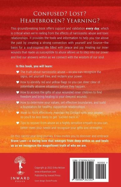 You're not lazy, crazy, or broken. Nor are you too fat, too shy, boring, or selfish. Don't believe the lies you were told. You are perfectly you, and that's your superpower! You're not alone. Support is available, and recovery is possible after the devastating experience of living with narcissistic abuse and toxic relationships. Your experience with the narcissist really was that bad, even if those around you don't understand that yet. Brave Love 365 is a daily book that meets you right where you are in your healing process and provides you with supportive, comforting bite-sized pieces of knowledge, information, and thought-provoking prompts for self-exploration. This format allows you to set your own pace and work as deeply as you're comfortable going. Author Erika Nelson is a licensed counselor, a narcissistic abuse relationship expert, and a survivor of abuse. Using her personal and professional knowledge and experience, she takes you on a sacred year-long journey in this comprehensive, impactful self-help book. In Brave Love 365, you will learn: Why you stayed in the toxic relationship even when you knew you should leave. The language of narcissistic abuse, to help you understand what you've been through. To develop a connection with your inner wisdom and soul's truth, as well as your Source. That is where the miracles and healing happen, and empowerment begins. Tools to help you on your journey back to health and wellness. How to set boundaries to avoid getting caught in another toxic trap. To identify unhealthy relationship dynamics so you can choose wisely and love bravely. While Brave Love 365 is geared toward intimate partner narcissistic abuse, it is also a valuable tool for those who are: Healing from toxic relationships with friends, dysfunctional family members, co-workers, and even counselors, doctors, or clergy members. Walking alongside a loved one in the grip of narcissistic abuse. Working with abuse survivors and their families in a professional setting, such as educators, attorneys, and counselors. If you're ready for compassionate support in quieting your mind and bringing hope, joy, and vibrancy back into your life, add Brave Love 365 to your cart now.