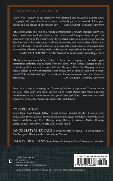 Introduction: Historicizing an Anti-Liberal Turn János Mátyás Kovács and Balázs Trencsényi Chapter 1: Reinventing Hungary with Revolutionary Fervor: The Declaration of National Cooperation as a Readers' Guide to the Fundamental Law of 2011 Chapter 2: Totalitarianism without Perpetrators? Politics of History in the "System of National Cooperation" Chapter 3: Civil Society in an Illiberal Democracy: Government-Friendly NGOs, "Foreign Agents," and Uncivil Publics Chapter 4: Beyond Electioneering: Minority Hungarians and the Vision of National Unification Chapter 5: The Role of Religion in the Illiberal Hungarian Constitutional System Chapter 6: The Right Hand Thinks: On the Sources of György Matolcsy's Economic Vision Chapter 7: Towards a "Work-Based Society"? Chapter 8: The Fear of Population Replacement Chapter 9: Votes, Ideology, and Self-Enrichment. The Campaign of Re-nationalization After 2010 Chapter 10: Viktor Orbán's Propaganda State Chapter 11: Ideology or Pragmatism? Interpreting Social Po
