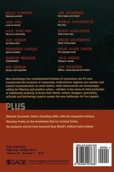 Winner 2008 Amnesty International Consumer Magazine of the Year About This Issue The internet has not only been a revolution for free speech - it's reinvented censorship. Cyber utopia has brought with it new forms of control - and it's not just authoritarian regimes that are limiting access to what we read and watch. Democracies are also curbing our right to information, whether in the name of child protection or copyright. Index on Censorship takes a close look at the new rules of the game, with contributions from bloggers, activists, journalists and experts around the world. About Index on Censorship From 2010 SAGE is proud to be the publisher of Index on Censorship, the award-winning magazine devoted to protecting and promoting free expression. International in outlook, outspoken in comment, Index reports on free expression violations around the world, publishes banned writing and shines a light on vital free expression issues through original, accessible and intelligent commentary and analysis, publishing some of the world's finest writers. Published four times a year (March, June, September, December), Index is available via annual subscription or to purchase on an issue-by-issue basis. Forthcoming 2010 issues: Free Speech and Music; Radio and the Promotion of Free Expression For subscription options click here www.indexoncensorship.org: the place to turn for free up-to-the-minute free expression news and comment
