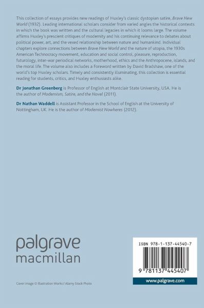This collection of essays provides new readings of Huxley's classic dystopian satire, Brave New World (1932). Leading international scholars consider from new angles the historical contexts in which the book was written and the cultural legacies in which it looms large. The volume affirms Huxley's prescient critiques of modernity and his continuing relevance to debates about political power, art, and the vexed relationship between nature and humankind. Individual chapters explore connections between Brave New World and the nature of utopia, the 1930s American Technocracy movement, education and social control, pleasure, reproduction, futurology, inter-war periodical networks, motherhood, ethics and the Anthropocene, islands, and the moral life. The volume also includes a 'Foreword' written by David Bradshaw, one of the world's top Huxley scholars. Timely and consistently illuminating, this collection is essential reading for students, critics, and Huxley enthusiasts alike.