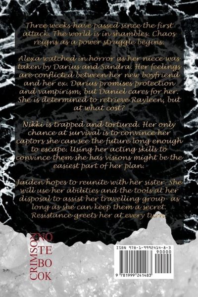 Three weeks have passed since the first attack. The world is in shambles. Chaos reigns as a power struggle begins. Alexa watched in horror as her niece was taken by Darius and Sandra. Her feelings are conflicted between her new boyfriend and her ex. Darius promises protection and vampirism, but Daniel cares for her. She is determined to retrieve Rayleen, but at what cost? Nikki is trapped and tortured. Her only chance at survival is to convince her captors she can see the future long enough to escape. Using her acting skills to convince them she has visions might be the easiest part of her plan. Jaiden hopes to reunite with her sister. She will use her abilities and the tools at her disposal to assist her travelling group- as long as she can keep them a secret. Resistance greets her at every turn.