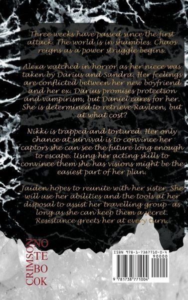 Three weeks have passed since the first attack. The world is in shambles. Chaos reigns as a power struggle begins. Alexa watched in horror as her niece was taken by Darius and Sandra. Her feelings are conflicted between her new boyfriend and her ex. Darius promises protection and vampirism, but Daniel cares for her. She is determined to retrieve Rayleen, but at what cost? Nikki is trapped and tortured. Her only chance at survival is to convince her captors she can see the future long enough to escape. Using her acting skills to convince them she has visions might be the easiest part of her plan. Jaiden hopes to reunite with her sister. She will use her abilities and the tools at her disposal to assist her travelling group- as long as she can keep them a secret. Resistance greets her at every turn.