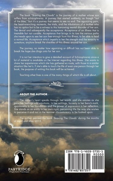 The book "Braving the Clouds" is the journey of a mother whose son suffers from schizophrenia. A journey that started suddenly, as though "out of the blue," but it's a journey that seems to see no end. The agonizing pain, the heart-wrenching moments, the trials, and the tribulations of a mother who has no option but to be a witness to this harrowing mental disorder of her son. The denial and subsequently the acceptance. Acceptance of an illness that is treatable but not curable. Acceptance that brings in its tow the various paths she treads upon to see her son free enough from this illness, to be able to lead a normal life. Acceptance which imparts to her the strength and the tenacity to somehow, anyhow break the shackles of this illness around her son. The journey, no matter how agonizing or difficult has not been able to break the hope she clings onto for her son. It is not her intention to give a detailed account of Schizophrenia since a lot of material is available on the Internet regarding this illness. She wants to share her experiences which she has gathered en route, with those in a similar situation like her's. If she's able to touch the life of even one person through her book, the purpose of writing this book will be achieved. Touching other lives is one of the many things of which life is all about.
