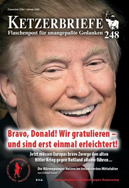 In memoriam Saddam HusseinBravo, Donald! Wir gratulieren - und sind erst einmal erleichtert... Die Wärmepumpe: Heizen im technisierten Mittelalter von Daniel DuvalNachtrag zum Hypothesenminimalismus von Fritz Erik HoevelsRachejustiz im Maskenprozeß gegen Dr. Walter Weber InterviewKleine Nachhilfe Geschichte von Kerstin SteinbachCaral und Hegel, oder: schlechte Karten für die Menschheit von Fritz Erik HoevelsFlugblatt: Wer hat uns verraten? Sozialdemokraten!Demonstration »Nie wieder Krieg« in Berlin