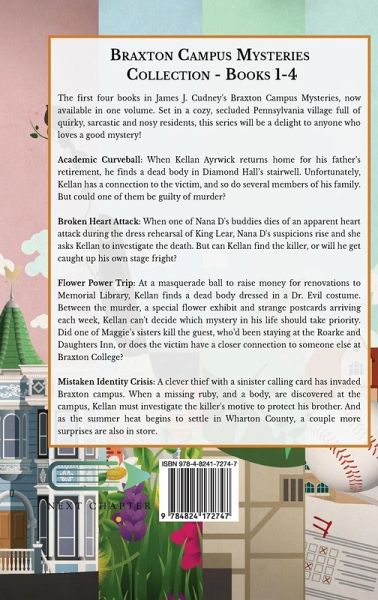 The first four books in James J. Cudney's Braxton Campus Mysteries, now available in one volume. Set in a cozy, secluded Pennsylvania village full of quirky, sarcastic and nosy residents, this series will be a delight to anyone who loves a good mystery! Academic Curveball: When Kellan Ayrwick returns home for his father's retirement, he finds a dead body in Diamond Hall's stairwell. Unfortunately, Kellan has a connection to the victim, and so do several members of his family. But could one of them be guilty of murder? Broken Heart Attack: When one of Nana D's buddies dies of an apparent heart attack during the dress rehearsal of King Lear, Nana D's suspicions rise and she asks Kellan to investigate the death. But can Kellan find the killer, or will he get caught up his own stage fright? Flower Power Trip: At a masquerade ball to raise money for renovations to Memorial Library, Kellan finds a dead body dressed in a Dr. Evil costume. Between the murder, a special flower exhibit and strange postcards arriving each week, Kellan can't decide which mystery in his life should take priority. Did one of Maggie's sisters kill the guest, who'd been staying at the Roarke and Daughters Inn, or does the victim have a closer connection to someone else at Braxton College? Mistaken Identity Crisis: A clever thief with a sinister calling card has invaded Braxton campus. When a missing ruby, and a body, are discovered at the campus, Kellan must investigate the killer's motive to protect his brother. And as the summer heat begins to settle in Wharton County, a couple more surprises are also in store.