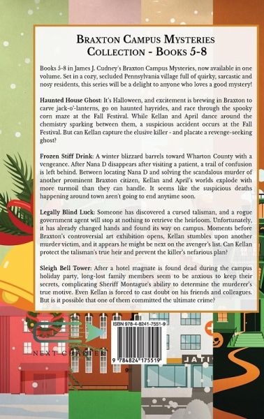 Books 5-8 in James J. Cudney's Braxton Campus Mysteries, now available in one volume. Set in a cozy, secluded Pennsylvania village full of quirky, sarcastic and nosy residents, this series will be a delight to anyone who loves a good mystery! Haunted House Ghost: It's Halloween, and excitement is brewing in Braxton to carve jack-o'-lanterns, go on haunted hayrides, and race through the spooky corn maze at the Fall Festival. While Kellan and April dance around the chemistry sparking between them, a suspicious accident occurs at the Fall Festival. But can Kellan capture the elusive killer - and placate a revenge-seeking ghost? Frozen Stiff Drink: A winter blizzard barrels toward Wharton County with a vengeance. After Nana D disappears after visiting a patient, a trail of confusion is left behind. Between locating Nana D and solving the scandalous murder of another prominent Braxton citizen, Kellan and April's worlds explode with more turmoil than they can handle. It seems like the suspicious deaths happening around town aren't going to end anytime soon. Legally Blind Luck: Someone has discovered a cursed talisman, and a rogue government agent will stop at nothing to retrieve the heirloom. Unfortunately, it has already changed hands and found its way on campus. Moments before Braxton's controversial art exhibition opens, Kellan stumbles upon another murder victim, and it appears he might be next on the avenger's list. Can Kellan protect the talisman's true heir and prevent the killer's nefarious plan? Sleigh Bell Tower: After a hotel magnate is found dead during the campus holiday party, long-lost family members seem to be anxious to keep their secrets, complicating Sheriff Montague's ability to determine the murderer's true motive. Even Kellan is forced to cast doubt on his friends and colleagues. But is it possible that one of them committed the ultimate crime?