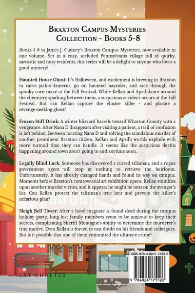 Books 5-8 in James J. Cudney's Braxton Campus Mysteries, now available in one volume. Set in a cozy, secluded Pennsylvania village full of quirky, sarcastic and nosy residents, this series will be a delight to anyone who loves a good mystery! Haunted House Ghost: It's Halloween, and excitement is brewing in Braxton to carve jack-o'-lanterns, go on haunted hayrides, and race through the spooky corn maze at the Fall Festival. While Kellan and April dance around the chemistry sparking between them, a suspicious accident occurs at the Fall Festival. But can Kellan capture the elusive killer - and placate a revenge-seeking ghost? Frozen Stiff Drink: A winter blizzard barrels toward Wharton County with a vengeance. After Nana D disappears after visiting a patient, a trail of confusion is left behind. Between locating Nana D and solving the scandalous murder of another prominent Braxton citizen, Kellan and April's worlds explode with more turmoil than they can handle. It seems like the suspicious deaths happening around town aren't going to end anytime soon. Legally Blind Luck: Someone has discovered a cursed talisman, and a rogue government agent will stop at nothing to retrieve the heirloom. Unfortunately, it has already changed hands and found its way on campus. Moments before Braxton's controversial art exhibition opens, Kellan stumbles upon another murder victim, and it appears he might be next on the avenger's list. Can Kellan protect the talisman's true heir and prevent the killer's nefarious plan? Sleigh Bell Tower: After a hotel magnate is found dead during the campus holiday party, long-lost family members seem to be anxious to keep their secrets, complicating Sheriff Montague's ability to determine the murderer's true motive. Even Kellan is forced to cast doubt on his friends and colleagues. But is it possible that one of them committed the ultimate crime?