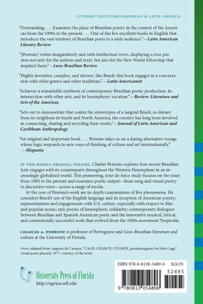 In this highly original volume, Charles Perrone explores how recent Brazilian lyric engages with its counterparts throughout the Western Hemisphere in an increasingly globalized world. This pioneering, tour-de-force study focuses on the years from 1985 to the present and examines poetic output-from song and visual poetry to discursive verse--across a range of media. At the core of Perrone's work are in-depth examinations of five phenomena: the use of the English language and the reception of American poetry in Brazil; representations and engagements with U.S. culture, especially with respect to film and popular music; epic poems of hemispheric solidarity; contemporary dialogues between Brazilian and Spanish American poets; and the innovative musical, lyrical, and commercially successful work that evolved from the 1960s movement Tropicalia.