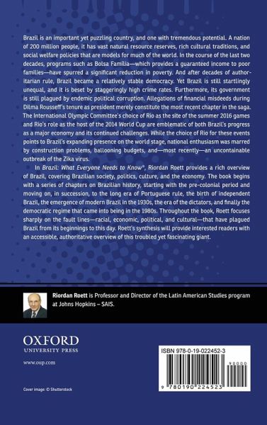 Brazil is one of the most important but puzzling countries in the world. A nation of 200 million people, it has vast natural resource reserves, rich cultural traditions, a middle class undergoing explosive growth, and social welfare policies that are models for much of the world ('la bolsa familia,' which provides a guaranteed income to poor families). And, after decades of authoritarian rule, it is a stable democracy. Yet it is beset by problems that no other advanced economy suffers from: staggeringly high crime rates, sky-high inequality levels, and endemic political corruption. Emblematic of these two sides of Brazil is the selection of Rio as site of both the next Summer Olympics and the next World Cup. While the choice of Rio for these events points to Brazil's expanding presence on the world stage, so far the construction and planning for the events have been disastrous, threatening to deeply embarrass the nation. In Brazil: What Everyone Needs to Know, Riordan Roett, an eminent scholar of Brazil and Latin America, will provide a rich overview of Brazil, covering Brazilian society, politics, culture, and the economy. The book begins with a series of chapters on Brazilian history, beginning with the pre-colonial period and moving on, in succession, to the long era of Portuguese rule, the birth of independent Brazil, the emergence of modern Brazil in the 1930s, the era of the dictators, and - finally - to the democratic regime that came into being in the 1980s. Throughout the book, Roett will focus sharply on the fault lines -- racial, economic, political, and cultural - that have plagued Brazil from its beginnings to this day. As the 2016 World Cup and Summer Olympics approach, interest in Brazil is sure to rise. Roett's synthesis will provide interested readers with an accessible, authoritative overview of this troubled yet fascinating giant.