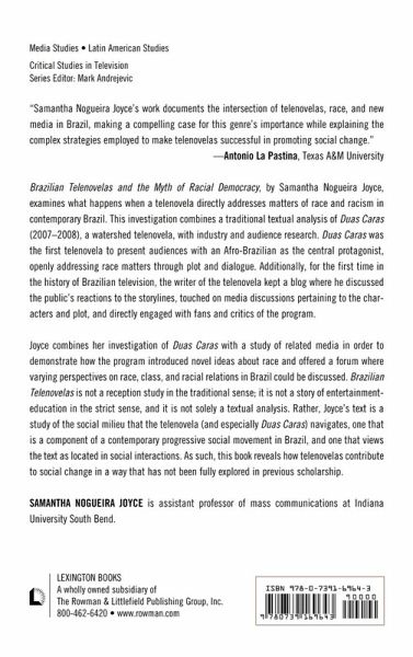 Brazilian Telenovelas and the Myth of Racial Democracy, by Samantha Nogueira Joyce, examines what happens when a telenovela directly addresses matters of race and racism in contemporary Brazil. This investigation provides a traditional textual analysis of Duas Caras (2007-2008), a watershed telenovela for two main reasons: It was the first of its kind to present audiences with an Afro-Brazilian as the main hero, openly addressing race matters through plot and dialogue. Additionally, for the first time in the history of Brazilian television, the author of Duas Caras kept a web blog where he discussed the public's reactions to the storylines, media discussions pertaining to the characters and plot, and directly engaged with fans and critics of the program. Joyce combines her investigation of Duas Caras with a study of related media in order to demonstrate how the program introduced novel ideas about race and also offered a forum where varying perspectives on race, class, and racial relations in Brazil could be discussed. Brazilian Telenovelas is not a reception study in the traditional sense, it is not a story of entertainment-education in the strict sense, and it is not solely a textual analysis. Instead, Joyce's text is a study of the social milieu that the telenovela (and especially Duas Caras) navigates, one that is a component of a contemporary progressive social movement in Brazil, and one that views the text as being located in social interactions. As such, this book reveals how telenovelas contribute to social change in a way that has not been fully explored in previous scholarship.