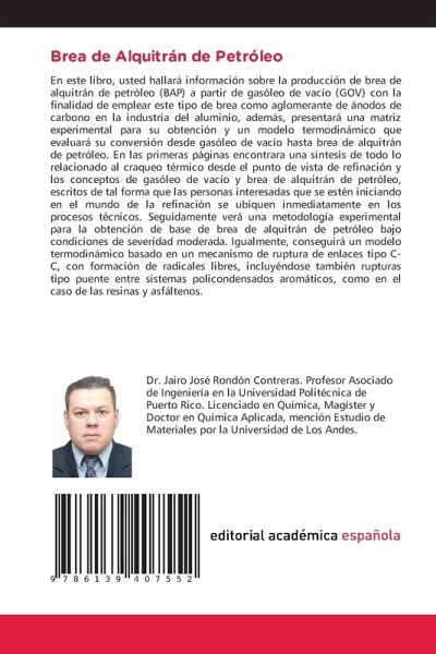 En este libro, usted hallará información sobre la producción de brea de alquitrán de petróleo (BAP) a partir de gasóleo de vacío (GOV) con la finalidad de emplear este tipo de brea como aglomerante de ánodos de carbono en la industria del aluminio, además, presentará una matriz experimental para su obtención y un modelo termodinámico que evaluará su conversión desde gasóleo de vacío hasta brea de alquitrán de petróleo. En las primeras páginas encontrara una síntesis de todo lo relacionado al craqueo térmico desde el punto de vista de refinación y los conceptos de gasóleo de vacío y brea de alquitrán de petróleo, escritos de tal forma que las personas interesadas que se estén iniciando en el mundo de la refinación se ubiquen inmediatamente en los procesos técnicos. Seguidamente verá una metodología experimental para la obtención de base de brea de alquitrán de petróleo bajo condiciones de severidad moderada. Igualmente, conseguirá un modelo termodinámico basado en un mecanismo de ruptura de enlaces tipo C-C, con formación de radicales libres, incluyéndose también rupturas tipo puente entre sistemas policondensados aromáticos, como en el caso de las resinas y asfáltenos.