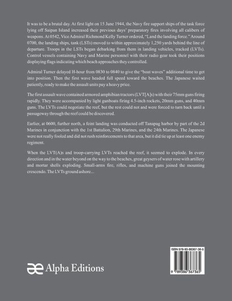 It was to be a brutal day. At first light on 15 June 1944, the Navy fire support ships of the task force lying off Saipan Island increased their previous days' preparatory fires involving all calibers of weapons. At 0542, Vice Admiral Richmond Kelly Turner ordered, "Land the landing force." Around 0700, the landing ships, tank (LSTs) moved to within approximately 1,250 yards behind the line of departure. Troops in the LSTs began debarking from them in landing vehicles, tracked (LVTs). Control vessels containing Navy and Marine personnel with their radio gear took their positions displaying flags indicating which beach approaches they controlled. Admiral Turner delayed H-hour from 0830 to 0840 to give the "boat waves" additional time to get into position. Then the first wave headed full speed toward the beaches. The Japanese waited patiently, ready to make the assault units pay a heavy price. The first assault wave contained armored amphibian tractors (LVT[A]s) with their 75mm guns firing rapidly. They were accompanied by light gunboats firing 4.5-inch rockets, 20mm guns, and 40mm guns. The LVTs could negotiate the reef, but the rest could not and were forced to turn back until a passageway through the reef could be discovered. Earlier, at 0600, further north, a feint landing was conducted off Tanapag harbor by part of the 2d Marines in conjunction with the 1st Battalion, 29th Marines, and the 24th Marines. The Japanese were not really fooled and did not rush reinforcements to that area, but it did tie up at least one enemy regiment. When the LVT(A)s and troop-carrying LVTs reached the reef, it seemed to explode. In every direction and in the water beyond on the way to the beaches, great geysers of water rose with artillery and mortar shells exploding. Small-arms fire, rifles, and machine guns joined the mounting crescendo. The LVTs ground ashore...