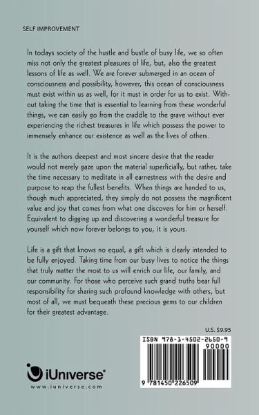 In todays society of the hustle and bustle of busy life, we so often miss not only the greatest pleasures of life, but, also the greatest lessons of life as well. We are forever submerged in an ocean of consciousness and possibility, however, this ocean of consciousness must exist within us as well, for it must in order for us to exist. Without taking the time that is essential to learning from these wonderful things, we can easily go from the craddle to the grave without ever experiencing the richest treasures in life which possess the power to immensely enhance our existence as well as the lives of others. It is the authors deepest and most sincere desire that the reader would not merely gaze upon the material superficially, but rather, take the time necessary to meditate in all earnestness with the desire and purpose to reap the fullest benefits. When things are handed to us, though much appreciated, they simply do not possess the magnificent value and joy that comes from what one discovers for him or herself. Equivalent to digging up and discovering a wonderful treasure for yourself which now forever belongs to you, it is yours. Life is a gift that knows no equal, a gift which is clearly intended to be fully enjoyed. Taking time from our busy lives to notice the things that truly matter the most to us will enrich our life, our family, and our community. For those who perceive such grand truths bear full responsibility for sharing such profound knowledge with others, but most of all, we must bequeath these precious gems to our children for their greatest advantage.