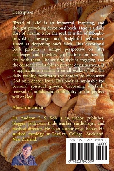 Dr. Andrew C. S. Koh brings readers Bread of Life, a powerful collection of 20 daily devotions based on 20 Bible passages. Each devotion begins with a verse by verse commentary followed by application and prayer. Drawing on his deep understanding and love of the scriptures, Dr. Koh encourages readers to read and meditate on the scriptures for themselves. With his deep insights, readers will gain a greater understanding of the context and background of each passage. In Bread of Life, Dr. Koh presents a unique opportunity for the modern reader to gain greater wisdom and knowledge of the Bible. Dr. Koh's devotional offers readers a chance to pause and reflect on the timeless truths of the scripture and to apply them into their own life in a meaningful and transformative way. With his thoughtful and engaging approach, Bread of Life is sure to become a favorite of readers who are seeking a daily devotional that is rooted in the scripture. Bread of Life is a must-read for those seeking to deepen their understanding and appreciation of the Bible. Comparable to popular devotional books such as Max Lucado's "Grace for the Moment" and Richard J. Foster's "Celebration of Discipline," Dr. Koh's Bread of Life offers readers a unique and inspiring opportunity to explore the Bread of Life. Pick up a copy today and discover how Dr. Koh's daily devotions can uplift, encourage, and stimulate your faith.