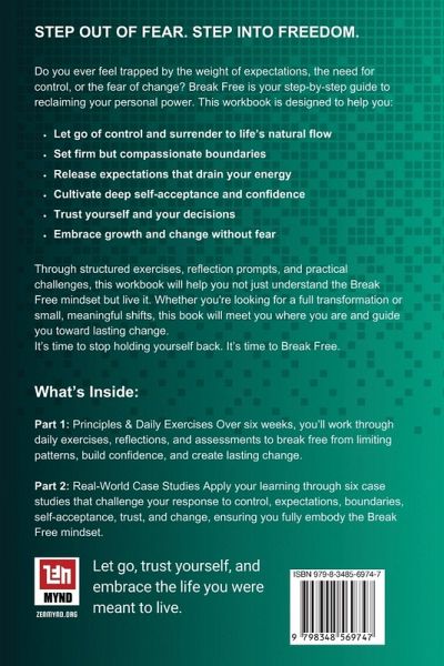 Step out of fear. Step into freedom Do you ever feel trapped by the weight of expectations, the need for control, or the fear of change? Break Free is your step-by-step guide to reclaiming your personal power. This workbook is designed to help you: * Let go of control and surrender to life's natural flow * Set firm but compassionate boundaries * Release expectations that drain your energy * Cultivate deep self-acceptance and confidence * Trust yourself and your decisions * Embrace growth and change without fear Through structured exercises, reflection prompts, and practical challenges, this workbook will help you not just understand the Break Free mindset but live it. Whether you're looking for a full transformation or small, meaningful shifts, this book will meet you where you are and guide you toward lasting change. It's time to stop holding yourself back. It's time to Break Free. What's Inside: Part 1: Principles & Daily Exercises Over six weeks, you'll work through daily exercises, reflections, and assessments to break free from limiting patterns, build confidence, and create lasting change. Part 2: Real-World Case Studies Apply your learning through six case studies that challenge your response to control, expectations, boundaries, self-acceptance, trust, and change, ensuring you fully embody the Break Free mindset.