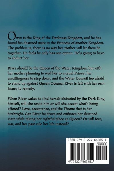 Onyx is the King of the Darkness Kingdom, and he has found his destined mate in the Princess of another Kingdom. The problem is, there is no way her mother will let them be together. He feels he only has one option. He's going to have to abduct her. River should be the Queen of the Water Kingdom, but with her mother planning to wed her to an cruel Prince, her unwillingness to step down, and the Water Council too afraid to stand up against Queen Oceana, River is left with her own issues to remedy. When River wakes to find herself abducted by the Dark King himself will she resist him or will she accept what's being offered? Love, acceptance, and the Throne that is her birthright. Can River be brave and embrace her destined mate while taking her rightful place as Queen? Or will fear, war, and her past rule her life instead?