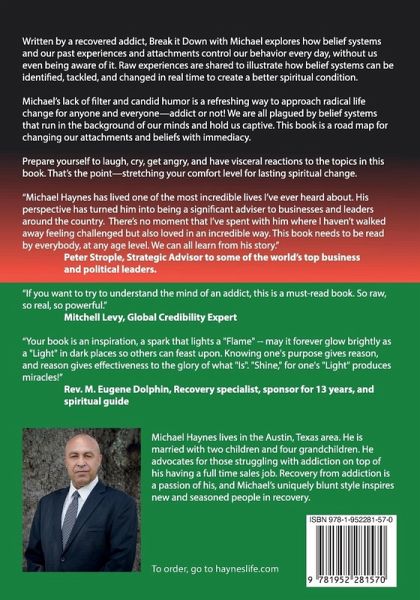In the words of the author, Michael Haynes, "This is the story about a major junkie, liar and thief and the path he took to becoming a decent, honest person." A couple of decades into his second marriage, his wife gave him an ultimatum: enter rehab or move out. With nothing to lose, he began by attending Cocaine Anonymous meetings. In this sobriety memoir, the author presents a raw, challenging look at his youth and how it shaped the man he has become. Addiction, sexual abuse and multiple treatment programs for his addiction to meth and recovery are all discussed with frankness and honesty. Once he attained sobriety, he discovered that he was trapped by beliefs that had served him well during his decades of being an addict, but needed a major overhaul if he wanted to become a better man. The patterns he relied on in surviving drug addiction were not serving him in his new life and he needed to find a way to transform those deeply held beliefs and patterns to realize his radical life change. In Part I of Break It Down with Michael: This Junkie's Path to Becoming a Spiritual Warrior, Michael examines what he calls Essentials such as his belief system, his attachments, control issues and demands, among others. He focuses on how each Essential affects other people and how he has participated in maintaining that particular belief or action. He lists his fears about each Essential along with what he resents and the corrective measures he intends to take that will help him change his inner belief system. Part II is dedicated to his Chief Concerns. Making amends, finding forgiveness, controlling his anger and more are all broken down in the same way. In Part III, the author discusses finding his "Spirit Dude" or guide and hashing out issues from his early life so that he could change his thinking and create a covenant with his higher power that would guide the rest of his life. Michael shares that this story isn't about a right way and a wrong way, just his personal recovery through spirit and he welcomes others to take what they need from it. With beautiful illustrations and no nonsense sharing, Break It Down with Michael is essential reading for anyone desiring to chart a path to spiritual change.