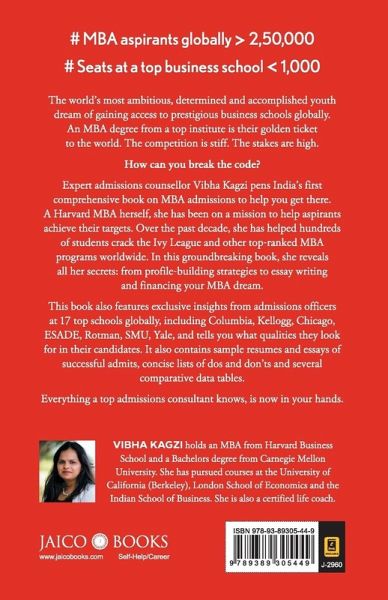 Fast-track your way into the Ivy League & other top colleges # MBA aspirants globally > 2,50,000 # Seats at a top business school < 1,000 The world's most ambitious, determined and accomplished youth dream of gaining access to prestigious business schools globally. An MBA degree from a top institute is their golden ticket to the world. The competition is stiff. The stakes are high. How can you break the code? Expert admissions counsellor Vibha Kagzi pens India's first comprehensive book on MBA admissions to help you get there. A Harvard MBA herself, she has been on a mission to help aspirants achieve their targets. Over the past decade, she has helped hundreds of students crack the Ivy League and other top-ranked MBA programs worldwide. In this groundbreaking book, she reveals all her secrets: from profile-building strategies to essay writing and financing your MBA dream. This book also features exclusive insights from admissions officers at 17 top schools globally, including Columbia, Kellogg, Chicago, ESADE, Rotman, SMU, Yale, and tells you what qualities they look for in their candidates. It also contains sample resumes and essays of successful admits, concise lists of dos and don'ts and several comparative data tables. Everything a top admissions consultant knows, is now in your hands.