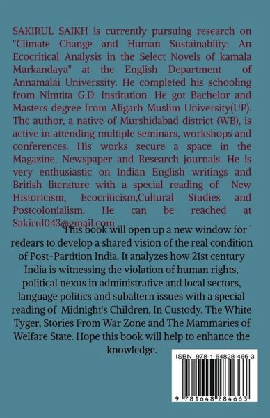 This book will open up a new window for readers to develop a shared vision of the real condition of 21st century India. It will try to analyze how modern India is witnessing the violation of human rights, political nexus in administrative sectors, language politics and post-partition subaltern issues with a special reading of Midnight's Children, In Custody, The White Tyger and The Mammaries of Welfare State.