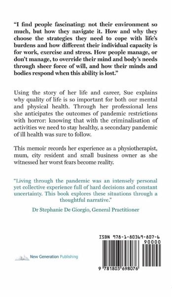 "I find people fascinating: not their environment so much, but how they navigate it. How and why they choose the strategies they need to cope with life's burdens and how different their individual capacity is for work, exercise and stress. How people manage, or don't manage, to override their mind and body's needs through sheer force of will, and how their minds and bodies respond when this ability is lost." Using the story of her life and career, Sue explains why quality of life is so important for both our mental and physical health. Through her professional lens she anticipates the outcomes of pandemic restrictions with horror: knowing that with the criminalisation of activities we need to stay healthy, a secondary pandemic of ill health was sure to follow. This memoir records her experience as a physiotherapist, mum, city resident and small business owner as she witnessed her worst fears become reality.