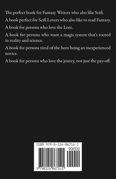 The perfect book for Fantasy Writers who also like Scifi. A book perfect for Scifi Lovers who also like to read Fantasy. A book for persons who love the Lore. A book for persons who want a magis system that's rooted in reality and science. A book for persons tired of the hero being an inexperienced novice. A book for persons who love the joure, not just the pay-off.
