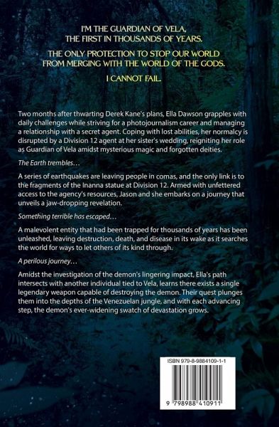 I'm the Guardian of Vela, the first in thousands of years. The only protection to stop our world from colliding with the world of the gods. I cannot fail. Two months after thwarting Derek Kane's plans, Ella Dawson grapples with daily challenges while striving for a photojournalism career and managing a relationship with a secret agent. Coping with lost abilities, her normalcy is disrupted by a Division 12 agent at her sister's wedding, reigniting her role as Guardian of Vela amidst mysterious magic and forgotten deities. The Earth trembles... A series of earthquakes are somehow leaving people with a mysterious illness, and Division 12 is left puzzled by their connection to the fragments of the Inanna statue. Requesting Ella's assistance, Jason and she- with the agency's untethered resources at their disposal- stumble upon a jaw-dropping revelation. Something terrible has escaped... A malevolent entity that had been trapped for thousands of years has been unleashed, leaving destruction, death, and disease in its wake as it searches the world for ways to let others of its kind through. A perilous journey... Amidst the investigation of the demon's lingering impact, Ella's path intersects with another individual tied to Vela and learns there exists a single legendary weapon capable of destroying the demon. Their quest plunges them into the depths of the Venezuelan jungle, and with each advancing step, the demon's ever-widening swatch of devastation grows.