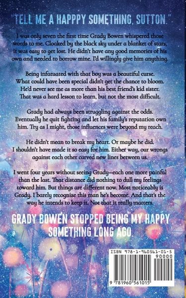 "Tell me a happy something, Sutton." I was only seven the first time Grady Bowen whispered those words to me. Cloaked by the black sky under a blanket of stars, it was easy to get lost. He didn't have any good memories of his own and needed to borrow mine. I would willingly give him anything. Being infatuated with that boy was a beautiful curse. What could have been special didn't get the chance to bloom. He'd never see me as more than his best friend's kid sister. That was a hard lesson to learn, but not the most difficult. Grady had always been struggling against the odds. Eventually he quit fighting and let his family's reputation own him. Try as I might, those influences were beyond my reach. He didn't mean to break my heart. Or maybe he did. I shouldn't have made it so easy for him. Either way, our wrongs against each other carved new lines between us. I went four years without seeing Grady-each one more painful than the last. That distance did nothing to dull my feelings toward him. But things are different now. Most noticeably is Grady. I barely recognize this man he's become. And that's the way he intends to keep it. Not that it really matters. Grady Bowen stopped being my happy something long ago.