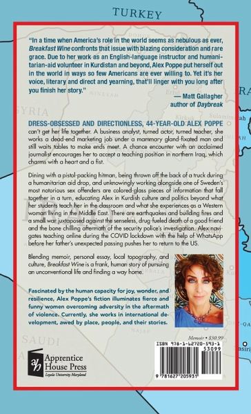 Dress-obsessed and directionless, 44-year-old Alex Poppe can't get her life together. A business analyst, turned actor, turned teacher, she works a dead-end marketing job under a mammary gland-fixated man and still waits tables to make ends meet. A chance encounter with an acclaimed journalist encourages her to accept a teaching position in northern Iraq, which charms with a heart and a fist.Dining with a pistol-packing hitman, being thrown off the back of a truck during a humanitarian aid drop, and unknowingly working alongside one of Sweden's most notorious sex offenders are colored-glass pieces of information that fall together in a turn, educating Alex in Kurdish culture and politics beyond what her students teach her in the classroom and what she experiences as a Western woman living in the Middle East. There are earthquakes and building fires and a small war juxtaposed against the senseless, drug-fueled death of a good friend and the bone chilling aftermath of the security police's investigation. Alex navigates teaching online during the COVID lockdown with the help of WhatsApp before her father's unexpected passing pushes her to return to the US.Blending memoir, personal essay, local topography, and culture, Breakfast Wine is a frank, human story of pursuing an unconventional life and finding a way home.