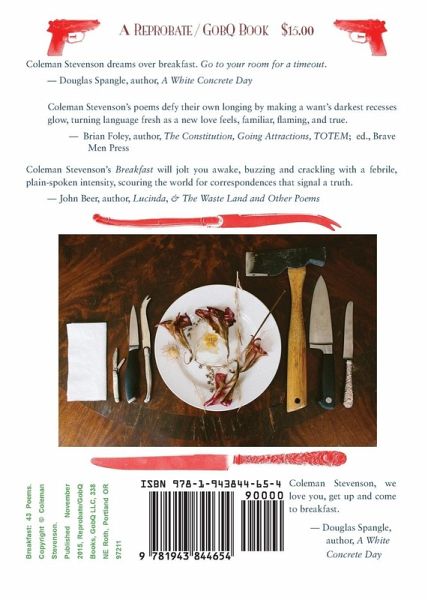 Praise for Coleman Stevenson & Breakfast: Breakfast. Washing the dishes. Gardening. Home. Nature. The weather. Coleman Stevenson takes the prosaic and transforms it with unexpected, yet true-feeling juxtapositions—‘rainbows, gasoline halos’—and philosophical stabs of mystic aloneness: ‘Some stones slide easily across a pond / some sink’; ‘You keep me like a secret, even from yourself.’ Her work vibrates everywhere with life and loss: part elegy, part dying to be born again. She herself claims at one point to be ‘held together by lightning’. Her poetry is that illuminating force striking right through and out of her. — Mark Mordue, author Dastgah: Diary of a Head Trip In the Fifties, Frank O’Hara daily went to lunch, taxis lurching past. Years later, Coleman Stevenson dreams over breakfasts, diary arrays. It is Indiana, most likely, sometimes winter, middletown wanting to be more, dreaming of gardens, Cole Porter playing in the background, the implements individual, clattering in collision, springtime bursting forth in some kind of dream. Here they are, the days, from the desiccated Xmas tree, family as brushing teeth over the sink, to the glass globe of an anticipated green season. Go to your room for a timeout. Coleman Stevenson we love you get up and come to breakfast. — Douglas Spangle, author, A White Concrete Day