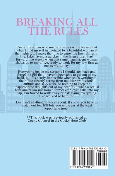 I'm rarely a man who mixes business with pleasure but when I find myself hypnotized by a beautiful woman at the nightclub, I make the time to enjoy the finer things in life. Like having a quickie in the linen closet. Fast forward two weeks when that same magnificent woman shows up to my office, ready to work for my law firm as our new attorney. Everything inside me screams I should step back and forget the girl that I haven't been able to get out of my head, but it's nearly impossible when she's working in the office directly across from me. Her professional attitude and sexy attire do nothing to keep the inappropriate thoughts out of my head. But when a sexual harassment lawsuit from a former employee falls into my lap, I'm forced to walk away or risk losing everything I've worked so hard for. Lust isn't anything to worry about. It's love you have to watch out for. It'll bite you in the ass at the least opportune time. ¿¿¿¿¿¿¿**This book was previously published as Cocky Counsel in the Cocky Hero Club