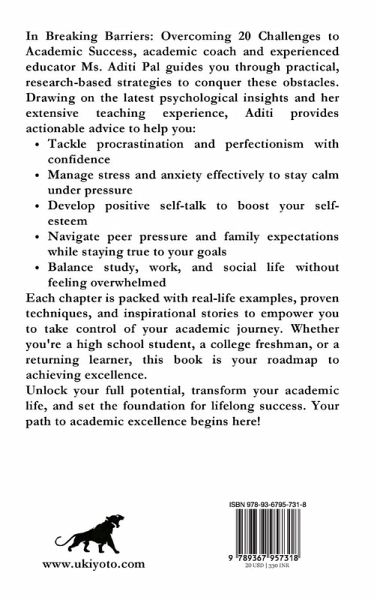 In Breaking Barriers: Overcoming 20 Challenges to Academic Success, academic coach and experienced educator Ms. Aditi Pal guides you through practical, research-based strategies to conquer these obstacles. Drawing on the latest psychological insights and her extensive teaching experience, Aditi provides actionable advice to help you: ¿ Tackle procrastination and perfectionism with confidenceManage stress and anxiety effectively to stay calm under pressure¿ Develop positive self-talk to boost your self-esteem ¿ Navigate peer pressure and family expectations while staying true to your goals Balance study, work, and social life without feeling overwhelmed Each chapter is packed with real-life examples, proven techniques, and inspirational stories to empower you to take control of your academic journey. Whether you're a high school student, a college freshman, or a returning learner, this book is your roadmap to achieving excellence. Unlock your full potential, transform your academic life, and set the foundation for lifelong success. Your path to academic excellence begins here!