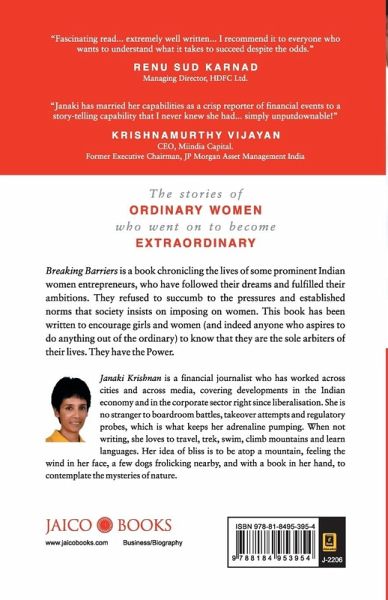 Success Stories of India's Leading Business Women Includes stories of: SHAHEEN MISTRI, VANDANA LUTHRA, RENUKA RAMNATH ZIA MODY, KIRAN MAZUMDAR-SHAW and others The stories of ordinary women who went on to become extraordinary BREAKING BARRIERS is a book chronicling the lives of some prominent Indian women entrepreneurs, who have followed their dreams and fulfilled their ambitions. They refused to succumb to the pressures and established norms that society insists on imposing on women. This book has been written to encourage girls and women (and indeed anyone who aspires to do anything out of the ordinary) to know that they are the sole arbiters of their lives. They have the Power.