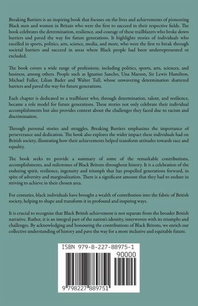 Breaking Barriers is an inspiring book that focuses on the lives and achievements of pioneering Black men and women in Britain who were the first to succeed in their respective fields. The book celebrates the determination, resilience, and courage of these trailblazers who broke down barriers and paved the way for future generations. It highlights stories of individuals who excelled in sports, politics, arts, science, media, and more, who were the first to break through societal barriers and succeed in areas where Black people had been underrepresented or excluded. The book covers a wide range of professions, including politics, sports, arts, sciences, and business, among others. People such as Ignatius Sancho, Una Marson, Sir Lewis Hamilton, Michael Fuller, Lilian Bader and Walter Tull, whose unwavering determination shattered barriers and paved the way for future generations. Each chapter is dedicated to a trailblazer who, through determination, talent, and resilience, became a role model for future generations. These stories not only celebrate their individual accomplishments but also provides context about the challenges they faced due to racism and discrimination. Through personal stories and struggles, Breaking Barriers emphasizes the importance of perseverance and dedication. The book also explores the wider impact these individuals had on British society, illustrating how their achievements helped transform attitudes towards race and equality. The book seeks to provide a summary of some of the remarkable contributions, accomplishments, and milestones of Black Britons throughout history. It is a celebration of the enduring spirit, resilience, ingenuity and triumph that has propelled generations forward, in spite of adversity and marginalization. There is a significant amount that they had to endure in striving to achieve in their chosen area. For centuries, black individuals have brought a wealth of contribution into the fabric of British society, helping to shape and transform it in profound and inspiring ways. It is crucial to recognize that Black British achievement is not separate from the broader British narrative. Rather, it is an integral part of the nation's identity, interwoven with its triumphs and challenges. By acknowledging and honouring the contributions of Black Britons, we enrich our collective understanding of history and pave the way for a more inclusive and equitable future.