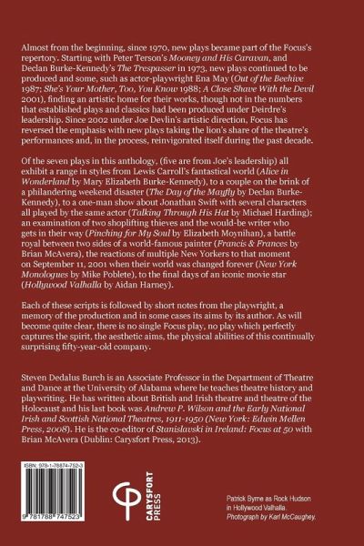 Of the seven plays in this anthology, (five are from Joe's leadership) all exhibit a range in styles from Lewis Carroll's fantastical world (Alice in Wonderland by Mary Elizabeth Burke-Kennedy), to a couple on the brink of a philandering weekenddisaster (The Day of the Mayfly by Declan Burke-Kennedy), to a one-man show about Jonathan Swift with several characters all played by the same actor (Talking Through His Hat by Michael Harding); an examination of two shoplifting thieves and the would-be writer who gets in their way (Pinching for My Soul by Elizabeth Moynihan), a battle royal between two sides of a world-famous painter (Francis & Frances by Brian McAvera), the reactions of multiple New Yorkers to that moment on September 11, 2001 when their world was changed forever (New York Monologues by Mike Poblete), to the final days of an iconic movie star (Hollywood Valhalla by Aidan Harney).