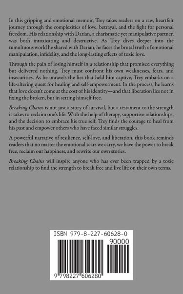 In this gripping and emotional memoir, Trey takes readers on a raw, heartfelt journey through the complexities of love, betrayal, and the fight for personal freedom. His relationship with Darian, a charismatic yet manipulative partner, was both intoxicating and destructive. As Trey dives deeper into the tumultuous world he shared with Darian, he faces the brutal truth of emotional manipulation, infidelity, and the long-lasting effects of toxic love. Through the pain of losing himself in a relationship that promised everything but delivered nothing, Trey must confront his own weaknesses, fears, and insecurities. As he unravels the lies that held him captive, Trey embarks on a life-altering quest for healing and self-empowerment. In the process, he learns that love doesn't come at the cost of his identity-and that liberation lies not in fixing the broken, but in setting himself free. Breaking Chains is not just a story of survival, but a testament to the strength it takes to reclaim one's life. With the help of therapy, supportive relationships, and the decision to embrace his true self, Trey finds the courage to heal from his past and empower others who have faced similar struggles. A powerful narrative of resilience, self-love, and liberation, this book reminds readers that no matter the emotional scars we carry, we have the power to break free, reclaim our happiness, and rewrite our own stories. Breaking Chains will inspire anyone who has ever been trapped by a toxic relationship to find the strength to break free and live life on their own terms.