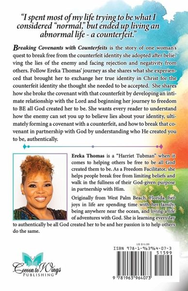 Breaking Covenants with Counterfeits is the story of one woman's quest to break free from the counterfeit identity she adopted after believing the lies of the enemy and facing rejection and negativity from others. Follow Ereka Thomas' journey as she shares what she experienced that brought her to exchange her true identity in Christ for the counterfeit identity she thought she needed to be accepted. She shares how she broke the covenant with that counterfeit by developing an intimate relationship with the Lord and beginning her journey to freedom to BE all God created her to be. She wants every reader to understand how the enemy can set you up to believe lies about your identity, ultimately forming a covenant with a counterfeit, and how to break that covenant in partnership with God by understanding who He created you to be, authentically.