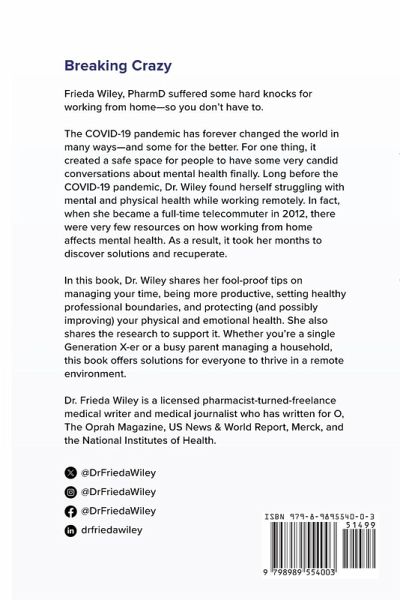 Frieda Wiley, PharmD, suffered some hard knocks for working from home-so you don't have to. The COVID-19 pandemic has forever changed the world in many ways-and some for the better. For one thing, it finally created a safe space for people to have candid conversations about mental health. Long before the COVID-19 pandemic, Dr. Wiley found herself struggling with mental and physical health while working remotely. When she became a full-time telecommuter in 2012, very few resources examined how working from home affects mental health. As a result, it took her months to discover solutions and recuperate. In this book, Dr. Wiley shares her fool-proof tips on managing your time, being more productive, setting healthy professional boundaries, and protecting (and possibly improving) your physical and emotional health. She also shares the research to support it. Whether you're a single Generation X-er or a busy parent managing a household, this book offers solutions for everyone to thrive in a remote environment. Dr. Frieda Wiley is an award-winning medical writer and journalist who has written for O, The Oprah Magazine, US News & World Report, Merck, and the National Institutes of Health. Before launching her writing career, she practiced as a pharmacist. She also enjoyed a brief career as a chemist in the aerospace industry.