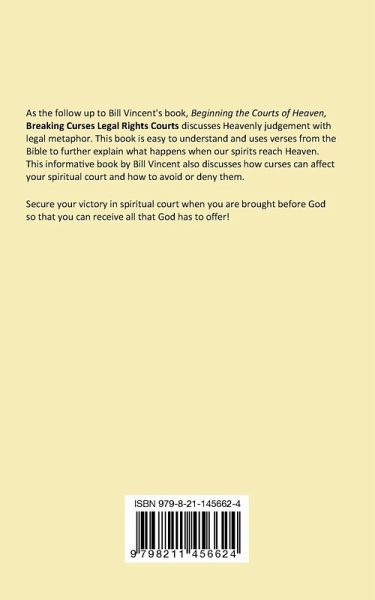 As the follow up to Bill Vincent's book, Beginning the Courts of Heaven, Breaking Curses Legal Rights Courts discusses Heavenly judgement with legal metaphor. This book is easy to understand and uses verses from the Bible to further explain what happens when our spirits reach Heaven. This informative book by Bill Vincent also discusses how curses can affect your spiritual court and how to avoid or deny them. Secure your victory in spiritual court when you are brought before God so that you can receive all that God has to offer!
