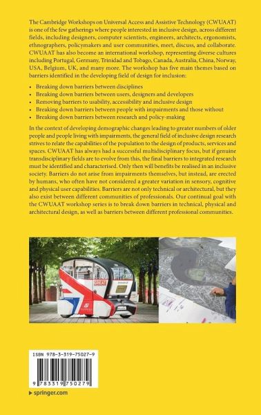 In the context of developing demographic changes leading to greater numbers of older people and people living with impairments, the general field of inclusive design research strives to relate the capabilities of the population to the design of products, services, and spaces. CWUAAT has always had a successful multidisciplinary focus, but if genuine transdisciplinary fields are to evolve from this, the final barriers to integrated research must be identified and characterised. Only then will benefits be realised in an inclusive society. Barriers do not arise from impairments themselves, but instead, are erected by humans, who often have not considered a greater variation in sensory, cognitive and physical user capabilities. Barriers are not only technical or architectural, but they also exist between different communities of professionals. Our continual goal with the CWUAAT workshop series is to break down barriers in technical, physical, and architectural design, as well as barriers between different professional communities.