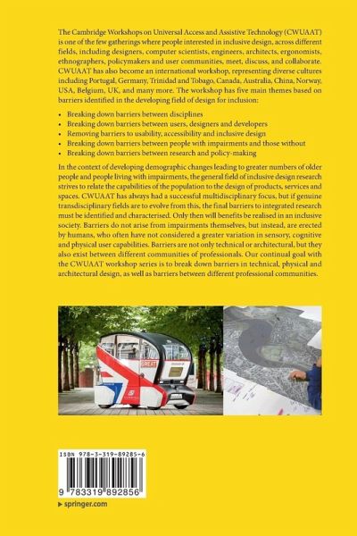 The Cambridge Workshops on Universal Access and Assistive Technology (CWUAAT) is one of the few gatherings where people interested in inclusive design, across different fields, including designers, computer scientists, engineers, architects, ergonomists, ethnographers, policymakers and user communities, meet, discuss, and collaborate. CWUAAT has also become an international workshop, representing diverse cultures including Portugal, Germany, Trinidad and Tobago, Canada, Australia, China, Norway, USA, Belgium, UK, and many more.