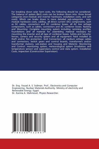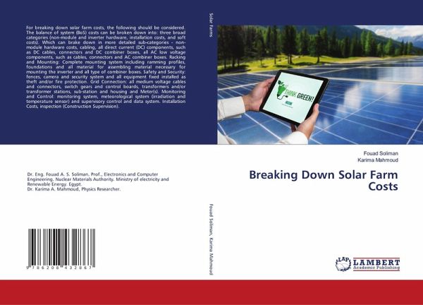 For breaking down solar farm costs, the following should be considered. The balance of system (BoS) costs can be broken down into: three broad categories (non-module and inverter hardware, installation costs, and soft costs). Which can brake down in more detailed sub-categories - non-module hardware costs, cabling, all direct current (DC) components, such as DC cables, connectors and DC combiner boxes, all AC low voltage components, such as cables, connectors and AC combiner boxes. Racking and Mounting: Complete mounting system including ramming profiles, foundations and all material for assembling material necessary for mounting the inverter and all type of combiner boxes. Safety and Security: fences, camera and security system and all equipment fixed installed as theft and/or fire protection. Grid Connection: all medium voltage cables and connectors, switch gears and control boards, transformers and/or transformer stations, sub-station and housing and Meter(s). Monitoring and Control: monitoring system, meteorological system (irradiation and temperature sensor) and supervisory control and data system. Installation Costs, inspection (Construction Supervision).