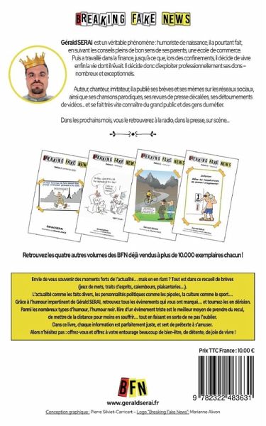 Un bon résumé peut contribuer au succès d'un livre. Donnez donc à vos lecteurs la possibilité de se faire la meilleure idée possible du contenu de celui-ci.Le résumé actuel de votre livre :Envie de vous souvenir des moments forts de l'actualité...mais en riant ?Tout est dans ce recueil de brèves (jeux de mots, traits d'esprit, calembours, plaisanteries...) L'actualité comme les faits divers, les personnalités politiques comme les pipoles, la culture comme le sport...Grâce à l'humour impertinent de Gérald SERAI, retrouvez tous les évènements qui vous ont marqué...et tournez les en dérision.Parmi les nombreux type d'humour, l'humour noir. Rire d'un évènement triste est le meilleur moyen de prendre du recul, de mettre de la distance pour moins en souffrir...tout en faisant en sorte de ne pas l'oublier.Dans ce livre, chaque information est parfaitement juste, et sert de prétexte à s'amuser.Alors n'hésitez pas: offrez-vous et offrez à votre entourage beaucoup de bien-être, de détente, de joie de vivre.