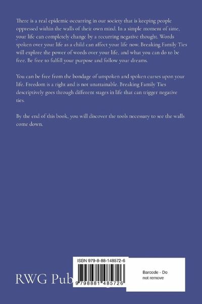 There is a real epidemic occurring in our society that is keeping people oppressed within the walls of their own mind. In a simple moment of time, your life can completely change by a recurring negative thought. Words spoken over your life as a child can affect your life now. Breaking Family Ties will explore the power of words over your life, and what you can do to be free. Be free to fulfill your purpose and follow your dreams. You can be free from the bondage of unspoken and spoken curses upon your life. Freedom is a right and is not unattainable. Breaking Family Ties descriptively goes through different stages in life that can trigger negative ties. By the end of this book, you will discover the tools necessary to see the walls come down.