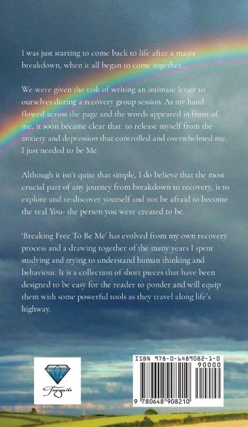 I was just starting to come back to life after a major breakdown, when it all began to come together... We were given the task of writing an intimate letter to ourselves during a recovery group session. As my hand flowed across the page and the words appeared in front of me, it soon became clear that to release myself from the anxiety and depression that controlled and overwhelmed me, I just needed to be Me. Although it isn't quite that simple, I do believe that the most crucial part of any journey from breakdown to recovery, is to explore and re-discover yourself and not be afraid to become the real You- the person you were created to be. 'Breaking Free To Be Me' has evolved from my own recovery process and a drawing together of the many years I spent studying and trying to understand human thinking and behaviour. It is a collection of short pieces that have been designed to be easy for the reader to ponder and will equip them with some powerful tools as they travel along life's highway.