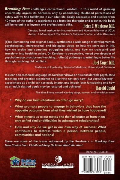 These are some of the issues addressed by the Kardeners in Breaking Free: How Chains From Childhood Keep Us From What We Want. * Why do our best intentions so often go awry? * What prompts people to engage in behaviors that have the opposite outcome from what they wished to have happened? * What attracts us to our mates and then alienates us from them-only to find similar difficulties in subsequent relationships? * How and why do we get in our own way of success? What contributes to distress within a person, between people, communities and nations?