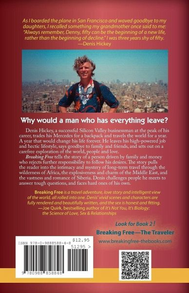 Why would a man who has everything leave? Denis Hickey, a successful Silicon Valley businessman at the peak of his career, trades his Mercedes for a backpack and travels the world for a year. A year that would change his life forever. He leaves his high-powered job and hectic lifestyle, says goodbye to family and friends, and sets out on a care-free exploration of the world, people, and love. Breaking Free tells the story of a person driven by family and money who rejects further responsibility to follow his vision. The story pulls the reader into the intimacy and mystery of long term travel through the wilderness of Africa, explosiveness and charm of the Middle East, and the vastness and romance of Siberia. Denis challenges people he meets to answer tough questions, and faces hard ones of his own.