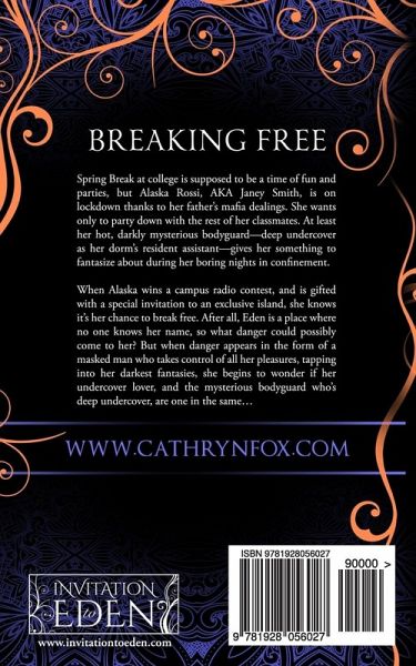 Spring Break at college is supposed to be a time of fun and parties, but Alaska Rossi, AKA Janey Smith, is on lockdown thanks to her father's mafia dealings. She wants only to party down with the rest of her classmates. At least her hot, darkly mysterious bodyguard- deep undercover as her dorm's resident assistant-gives her something to fantasize about during her boring nights in confinement. When Alaska wins a campus radio contest, and is gifted with a special invitation to an exclusive island, she knows it's her chance to break free. After all, Eden is a place where no one knows her name, so what danger could possibly come to her? But when danger appears in the form of a masked man who takes control of all her pleasures, tapping into her darkest fantasies, she begins to wonder if her undercover lover, and the mysterious bodyguard who's deep undercover, are one in the same...