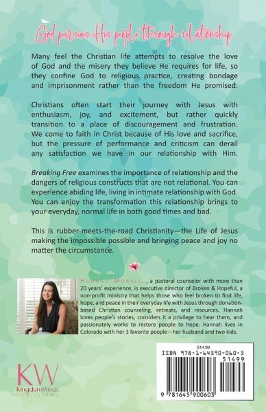 God began His journey with humanity in relationship and continues to pursue this relationship with us throughout history. The Christian life was never supposed to be an attempt to resolve the love of God and the misery that many believe He requires for life. People have tried to confine God into religion, which creates bondage and imprisonment rather than the freedom He promised. Christians often start their journey with Jesus with enthusiasm, joy, and excitement, but rather quickly transition to a place of discouragement and frustration. We come to faith in Christ because of His love and sacrifice, but the pressure of performance and criticism can derail any satisfaction we have in our relationship with Him. Breaking Free examines the importance of relationship and the dangers of religious constructs that are not relational. You can experience abiding life, living in intimate relationship with God, and enjoy the transformation this relationship brings to your everyday, normal life as well as the trials and hard circumstances. This is rubber-meets-the-road Christianity-the Life of Jesus making the impossible possible and bringing peace and joy no matter the circumstance. Hannah Morrell is executive director of Broken & Hopeful and a pastoral counselor. She has been working in lay counseling for almost 20 years and holds a Master's degree in Counseling Ministries. Hannah started Broken & Hopeful in 2016 because she was called to help those who feel broken find life, hope, and peace in their everyday life with Jesus. Broken & Hopeful is a nonprofit ministry providing donation-based Christian counseling, blog posts, an annual women's retreat, a podcast called Undercurrents of Hope, and resources including books and video courses. Hannah loves people's stories, considers it a privilege to hear them, and passionately works to restore people to hope.