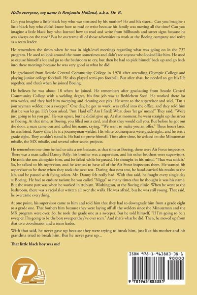Hello everyone, my name is Benjamin Holland, a.k.a. Dr. B. Can you imagine a little black boy who was tortured by his mother? He and his sister... Can you imagine a little black boy who didn't know how to read or write because his family was moving all the time? Can you imagine a little black boy who learned how to read and write from billboards and street signs because he was always on the road? But he overcame all of those adversities to work at the Boeing company and retire as a team leader. He remembers the times when he was in high-level meetings regarding what was going on in the 737 program. He used to look around the room sometimes and didn't see anyone who looked like him. He used to excuse himself a lot and go to the bathroom to cry, but then he had to pick himself back up and go back into these meetings because he was very good at what he did. He graduated from Seattle Central Community College in 1978 after attending Olympic College and playing junior college football. He also played semi-pro football. But after that, he needed to get his life together, and that's when he joined Boeing. He believes he was about 18 when he joined. He remembers after graduating from Seattle Central Community College with a welding degree, his first job was at Bethlehem Steel. He worked there for two weeks, and they had him sweeping and cleaning out pits. He went to the supervisor and said, "I'm a journeyman welder, not a sweeper." One day, he got to work, was called into the office, and they told him that he was let go. He's been asked, "Am I laid off? Am I fired? What does 'let go' mean?" They said, "We're just going to let you go." He was upset, but he didn't give up. At that moment, he went straight up the street to Boeing. At that time, at Boeing, you filled out a card, and then they would call you. But before he got out the door, a man came out and called his name, saying, "We want to make you an offer." Three hours later, he was hired. Know this: He is a journeyman welder. His white counterparts were grade eight, and he was a grade eight. They couldn't stand it. He had to prove himself. Time after time, he welded on the Minuteman missile, the MX missile, and several other secret projects. At one point, his supervisor came to him and told him that they had to downgrade him from a grade eight to a grade one. That bothers him because they were laying off all the welders since the Minuteman and the MX program were over. So, he took the grade one as a sweeper. But he told himself, "If I'm going to be a sweeper, I'm going to be the best sweeper they've ever seen." And that's what he did. Then, he moved up from that to a coordinator and a team leader. With that said, he never gave up because they were trying to break him, just like his mother and his grandma tried to break him. But he never gave up... That little black boy was me!
