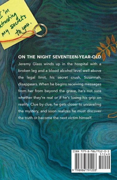 On the night seventeen-year-old Jeremy Glass winds up in the hospital with a broken leg and a blood alcohol level well above the legal limit, his secret crush, Susannah, disappears. When he begins receiving messages from her from beyond the grave, he's not sure whether they're real or if he's losing his grip on reality. Clue by clue, he gets closer to unraveling the mystery, and soon realizes he must discover the truth or become the next victim himself.